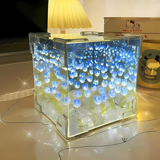 LÁMPARA CON TULIPANES INFINITOS EN FORMA DE CUBO